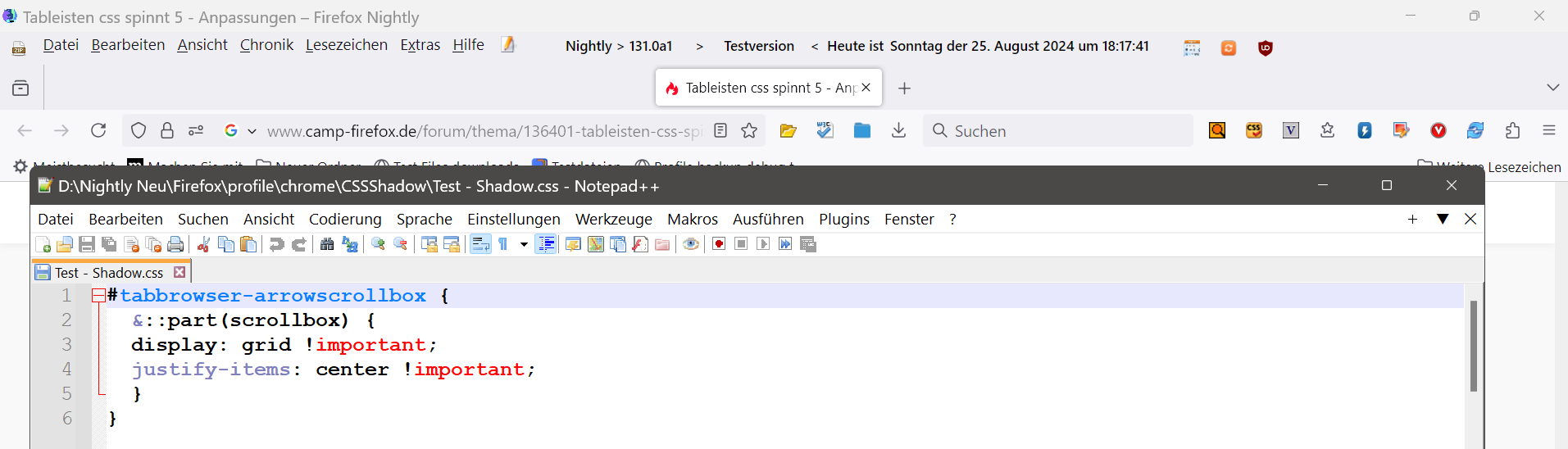 • Die Lösung aus #79 bewirkt hier in der userChromeShadow.css nichts, der Code von FuchsFan aus #93 in der userChrome.css läßt die Tabs zusammengestaucht oberhalb der Menüleiste landen. Diese werden hier mit einem eigenen css unter die Menü-Leiste verfrachtet. Wenn ich dann den dafür zuständigen Code ebenfalls in die userChrome.css packe, ist es nicht mehr gestaucht aber immer noch oberhalb der Menü-Leiste.