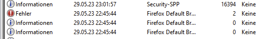 Du hast Recht. Ich hatte vorhin vergessen, in der Ereignisanzeige nachzusehen. Dort habe ich den Eintrag mit Event-ID 2 auch. Allerdings kommen vorher zur selben Uhrzeit zwei Ereignisse "Der Vorgang wurde erfolgreich beendet. INFO - Using HTTP backend wininet.dll. INFO - Using remote settings URL: https://firefox.settings.services.mozilla.com/v1/buckets/mai…t/records/state".