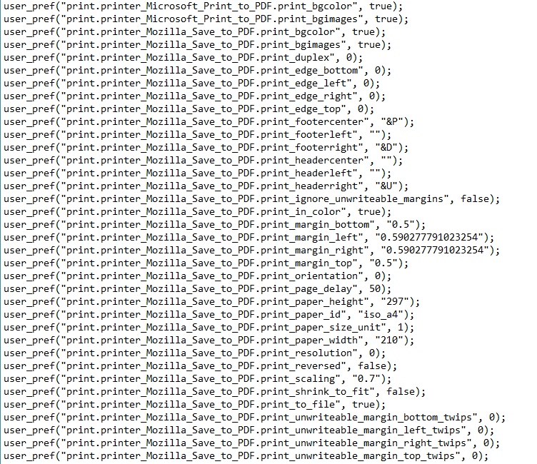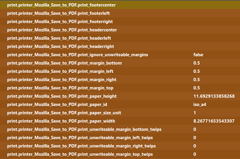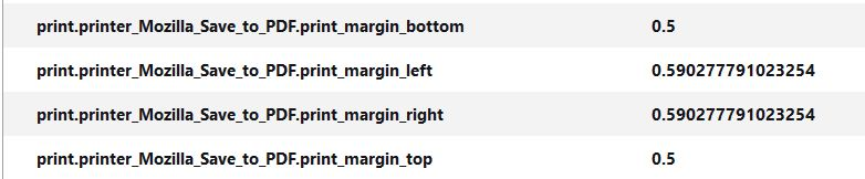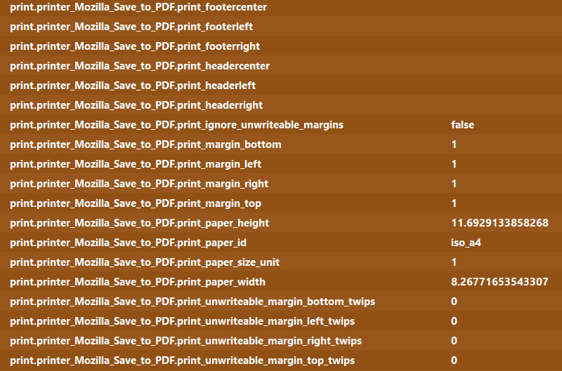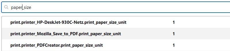 • Dann habe ich die Einheit für die Seitenränder wieder auf cm umgestellt. (print.printer_Mozilla_Save_to_PDF.print_paper_size_unit = 1)