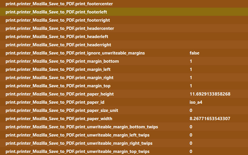 • Habe zuerst in about:config alle Einträge unter print.printer_Mozilla_Save_to_PDF gelöscht.
