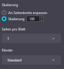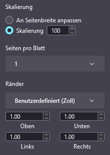 • Nach dem Neustart habe ich den pdf-Druckdialog geöffnet und meine Einstellungen gemacht. Bei den Seitenrändern war nun wieder Zoll eingestellt (das hatte ich früher mal auf cm geändert).