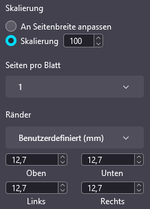 5) Druckdialog "Ränder" ausgeklappt -> mm, aber "12,7" und nicht "25,4"