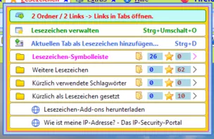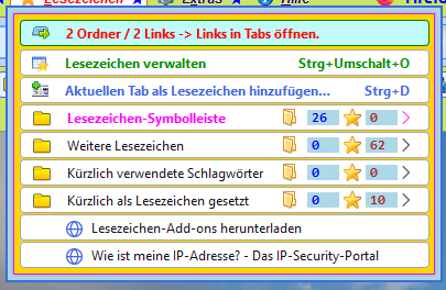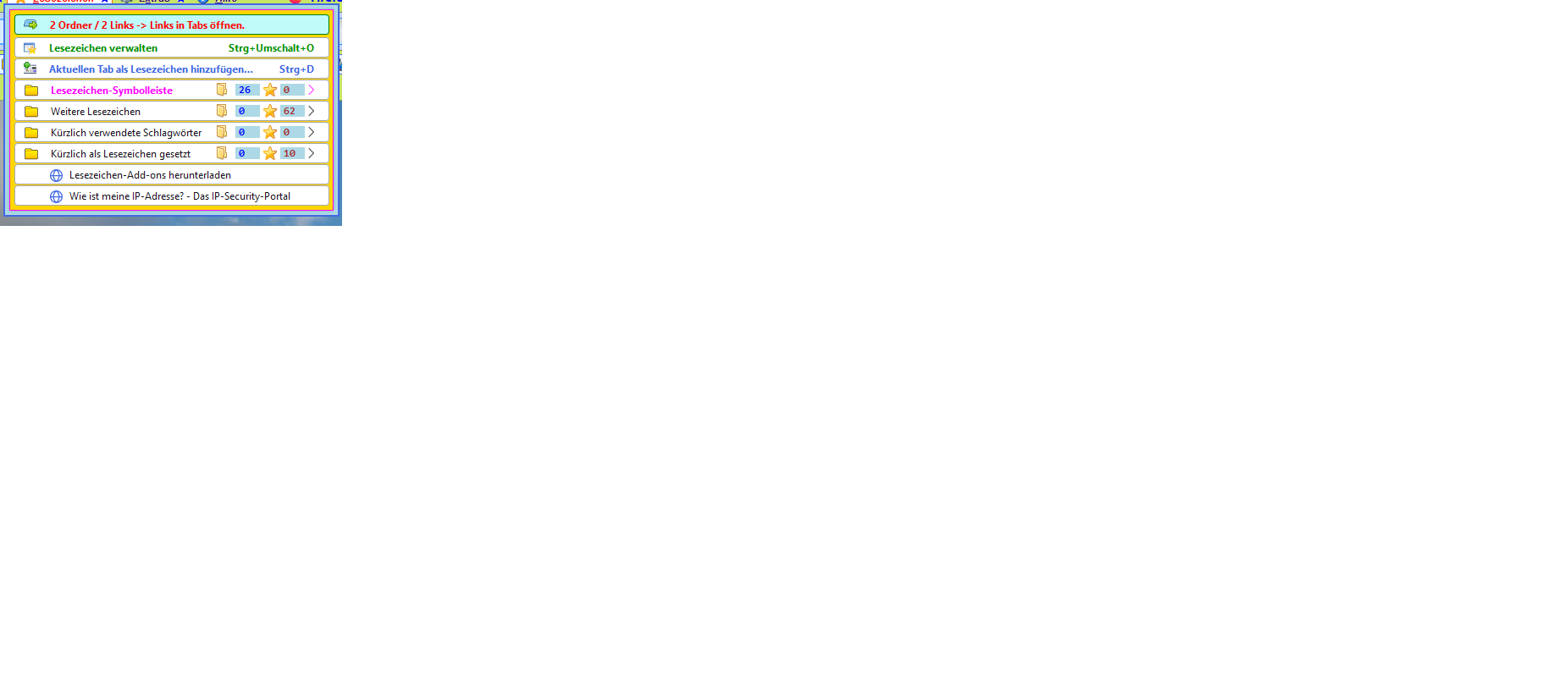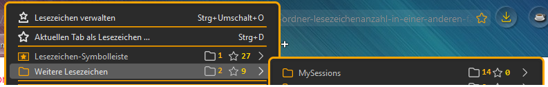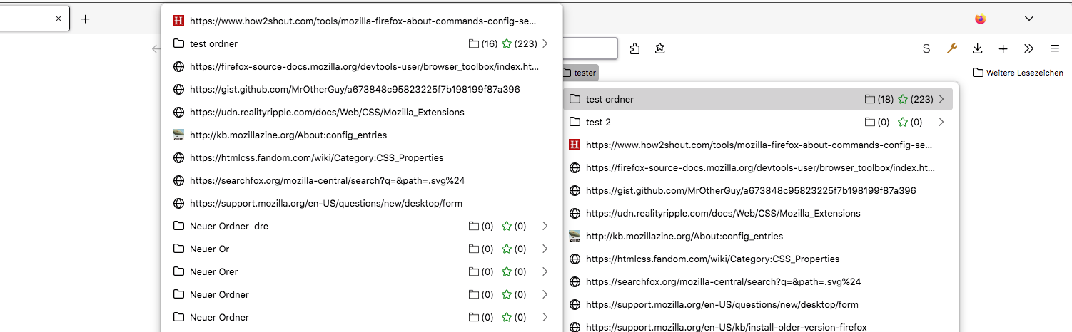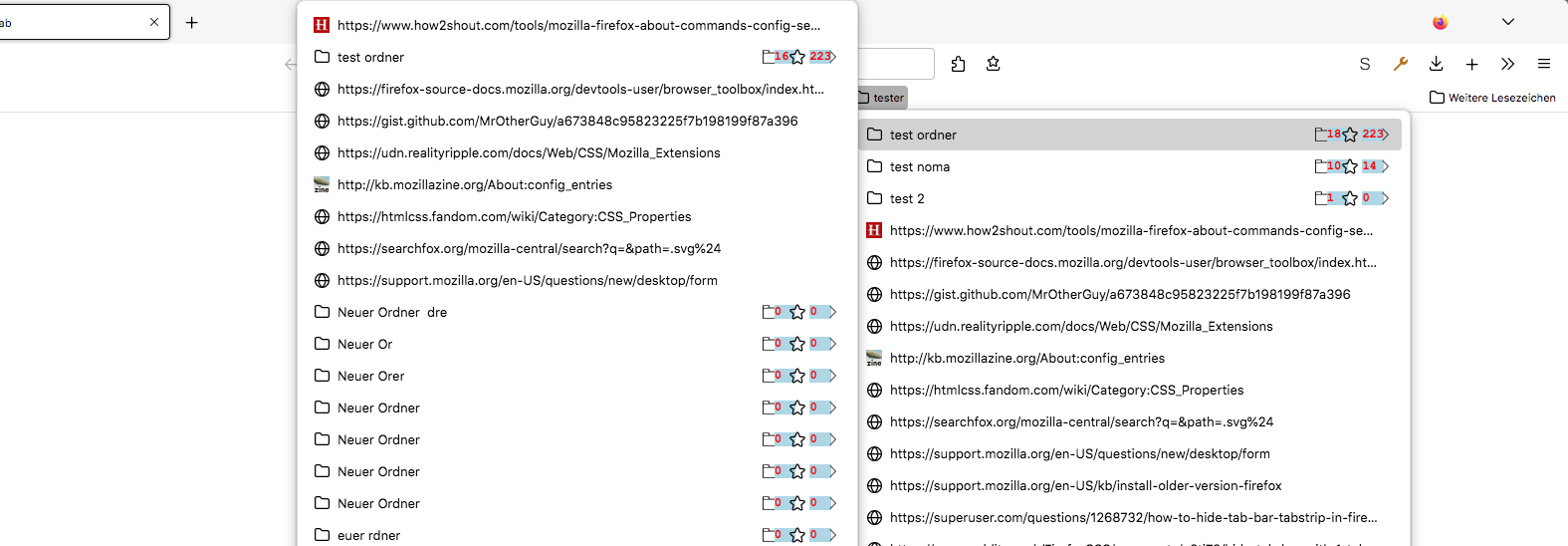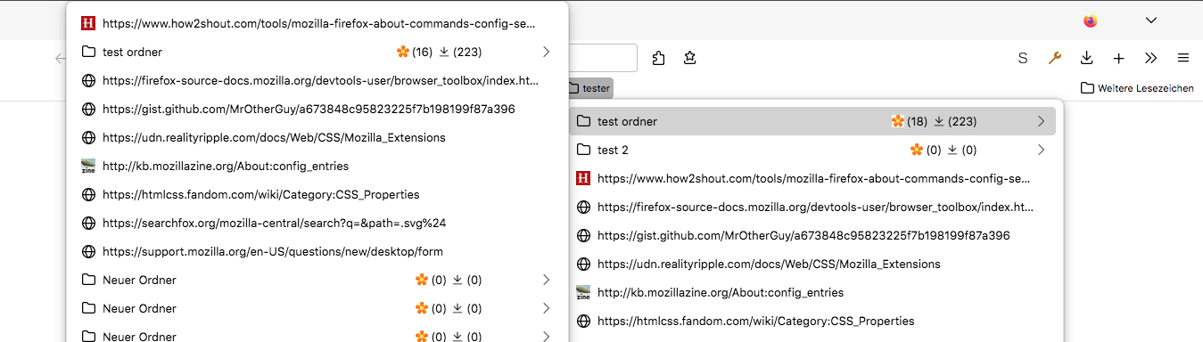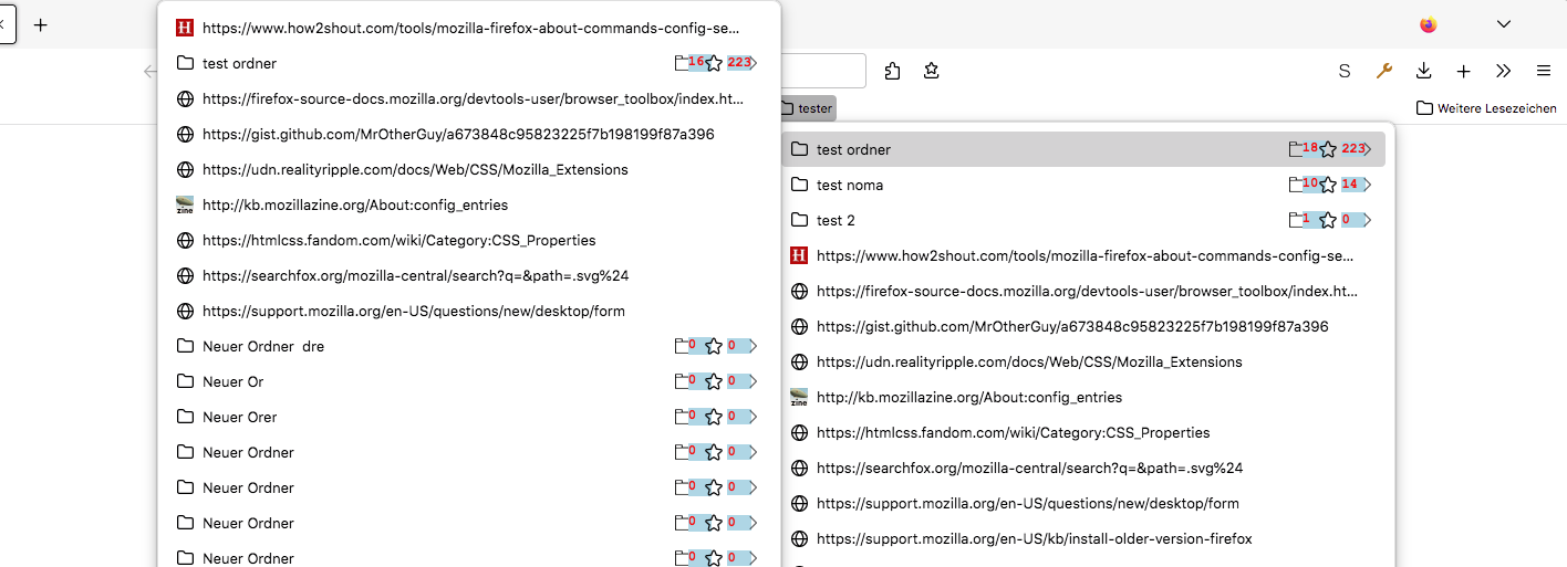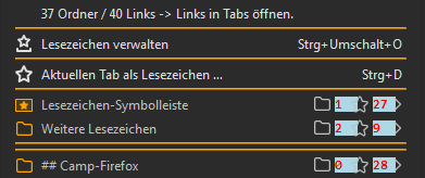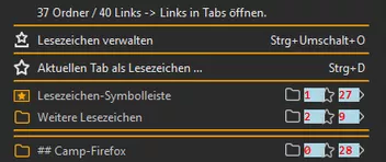 JavaScript Alles anzeigen// JavaScript Document // BookmarkCount.uc.js - modified #2 // Author BrokenHeart // Source file https://www.camp-firefox.de/forum/thema/136572/?postID=1229536#post1229536 // Endor Repository Link https://github.com/Endor8/userChrome.js/blob/master/Firefox%20115/BookmarkCount.uc.js (function() { if (!window.gBrowser) return; setTimeout(function() { setFunction(); },50); //Custom icons in profile/chrome/icons folder, code shared by Mira_Belle let profilePath = PathUtils.toFileURI(PathUtils.join(PathUtils.profileDir, 'chrome', 'icons')) let ico1 = "iconfolder.png" let ico2 = "iconitems.png" function setFunction() { const css =` /* First icon / folder count / second icon / item count */ .countClass1::before { content: ""; background-image: url(${profilePath}/${ico1}); background-repeat: no-repeat; background-size: 16px; /* icon size */ background-position: center; margin-inline: 16px 2px; /* icon 1 distance left right */ height: 16px; width: 16px; /*fill: black; fill-opacity: 1;*/ } .countClass1 label { margin-inline: 0px !important; } .countClass1::after { content: attr(data-value1); /*color: black;*/ } .countClass2::before { content: ""; background-image: url(${profilePath}/${ico2}); /*background-image: url("chrome://browser/skin/bookmark-hollow.svg");*/ background-repeat: no-repeat; background-size: 16px; /* icon size */ background-position: center; margin-inline: 2px 2px; /* icon 2 distance left right */ height: 16px; width: 16px; /*fill: black; fill-opacity: 1;*/ } .countClass2::after { content: attr(data-value2); /*color: black;*/ margin-inline: 0 4px !important; /* distance right */ } .countClass2 image { order: 1; } `; const sss = Cc['@mozilla.org/content/style-sheet-service;1'].getService(Ci.nsIStyleSheetService); const uri = Services.io.newURI('data:text/css,' + encodeURIComponent(css)); sss.loadAndRegisterSheet(uri, sss.AGENT_SHEET); let bmbMenu = document.getElementById('bookmarks-menu-button'); let bookMenu = document.getElementById('bookmarksMenu'); let persToolBar = document.getElementById('PersonalToolbar'); if(bmbMenu) bmbMenu.addEventListener('popupshowing', onPopupShowing ); if(bookMenu) bookMenu.addEventListener('popupshowing', onPopupShowing ); if(persToolBar) persToolBar.addEventListener('popupshowing', onPopupShowing ); } function onPopupShowing(aEvent) { let popup = aEvent.originalTarget; for (let item of popup.children) { if (item.localName != 'menu' || item.id?.startsWith('history')) continue; setTimeout(() => { let itemPopup = item.menupopup; itemPopup.hidden = true; itemPopup.collapsed = true; itemPopup.openPopup(); itemPopup.hidePopup(); let menuitemCount = 0; let menuCount = 0; for (let subitem of itemPopup.children) { if (subitem.classList.contains('bookmark-item') && !subitem.disabled && !subitem.hidden) { if (subitem.localName == 'menuitem') { menuitemCount++; } else if (subitem.localName == 'menu') { menuCount++; } } } itemPopup.hidden = false; itemPopup.collapsed = false; let label1 = item.childNodes[3]; label1.classList.add('countClass1'); let strCountOut1 = "(" + menuCount + ")" label1.setAttribute('data-value1', strCountOut1); let label2 = item.childNodes[4]; label2.classList.add('countClass2'); let strCountOut2 = "(" + menuitemCount + ")" label2.setAttribute('data-value2', strCountOut2); }, 100); } } })();