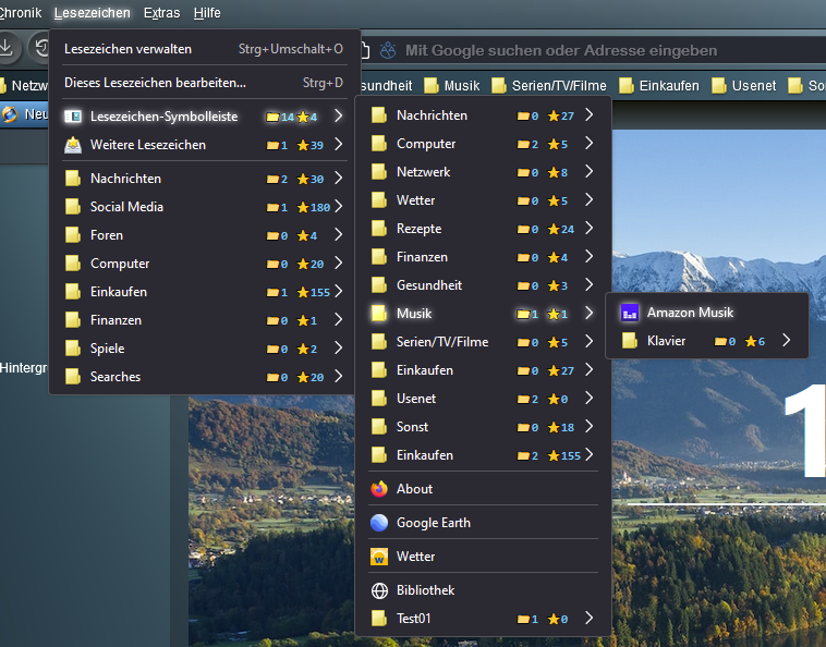 Alles anzeigen(function() { if (!window.gBrowser) return; setTimeout(function() { setFunction(); },50); function setFunction() { const css =` .countClass::after { content: attr(data-value); color: red; } `; const sss = Cc['@mozilla.org/content/style-sheet-service;1'].getService(Ci.nsIStyleSheetService); const uri = Services.io.newURI('data:text/css,' + encodeURIComponent(css)); sss.loadAndRegisterSheet(uri, sss.AGENT_SHEET); let bmbMenu = document.getElementById('bookmarks-menu-button'); let bookMenu = document.getElementById('bookmarksMenu'); let persToolBar = document.getElementById('PersonalToolbar'); if(bmbMenu) bmbMenu.addEventListener('popupshowing', onPopupShowing ); if(bookMenu) bookMenu.addEventListener('popupshowing', onPopupShowing ); if(persToolBar) persToolBar.addEventListener('popupshowing', onPopupShowing ); } function onPopupShowing(aEvent) { let popup = aEvent.originalTarget; for (let item of popup.children) { if (item.localName != 'menu' || item.id?.startsWith('history')) continue; setTimeout(() => { let itemPopup = item.menupopup; itemPopup.hidden = true; itemPopup.collapsed = true; itemPopup.openPopup(); itemPopup.hidePopup(); let menuitemCount = 0; let menuCount = 0; for (let subitem of itemPopup.children) { if (subitem.classList.contains('bookmark-item') && !subitem.disabled && !subitem.hidden) { if (subitem.localName == 'menuitem') { menuitemCount++; } else if (subitem.localName == 'menu') { menuCount++; } } } itemPopup.hidden = false; itemPopup.collapsed = false; let label = item.childNodes[3]; //label.menu-iconic-text label.classList.add('countClass'); let strCountOut = " (" + menuCount + "/" + menuitemCount + ")" label.setAttribute('data-value', strCountOut); }, 100); } } })(); -