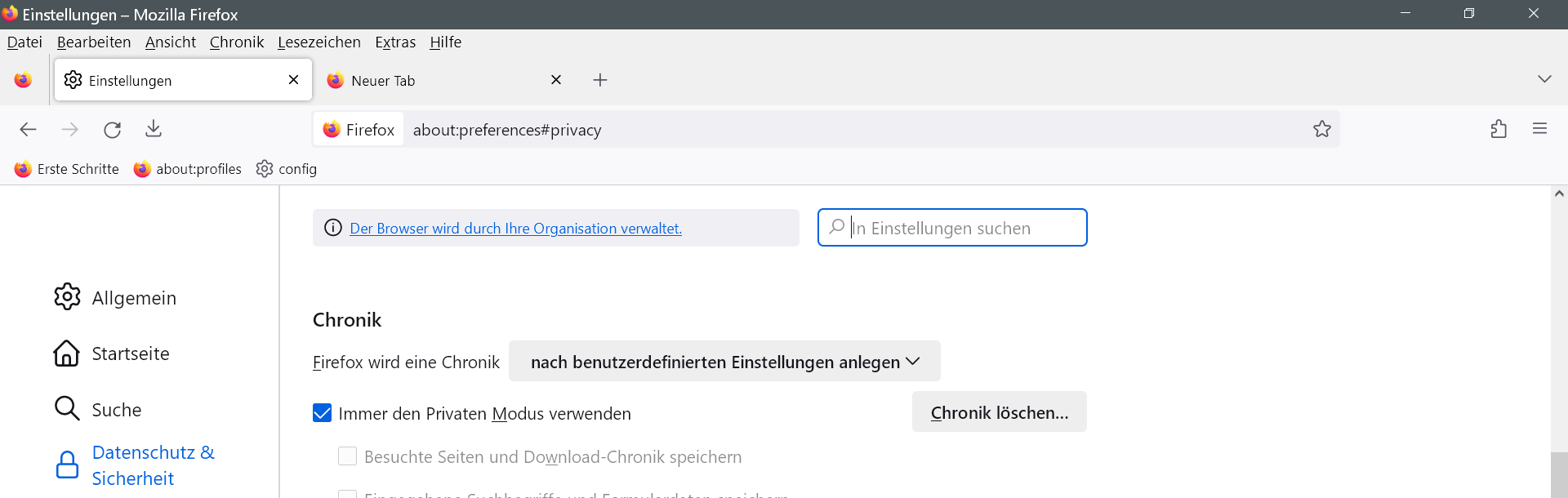 Unter "Chronik" habe ich "immer den privaten Modus verwenden" eingestellt.