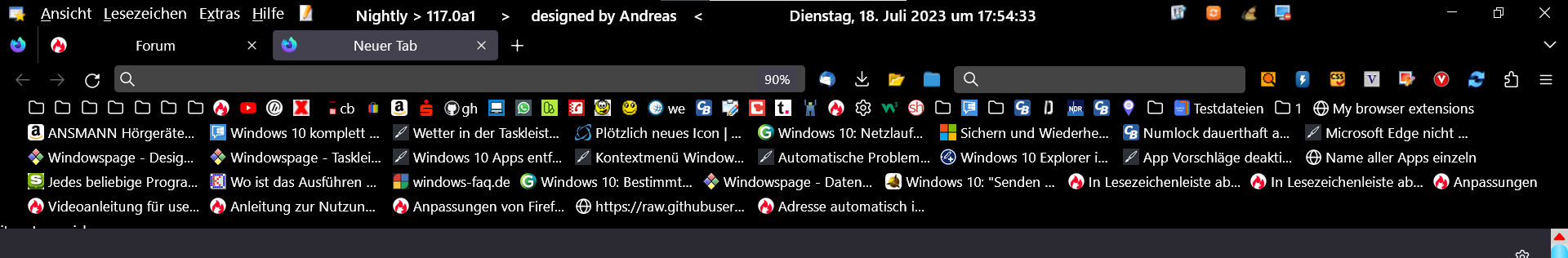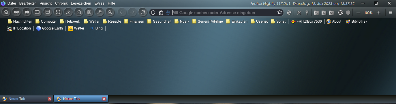 ich habe gerade das Nightly aktualisiert und plötzlich wird mir auf der Startseite (Standardseite) meine mehrzeilige Lesezeichenleiste nicht mehr korrekt angezeigt, wenn ich die Option „Nur im neuen Tab anzeigen“ wähle. Wenn ich „Immer anzeigen“ auswähle, ist alles OK. Es sieht so aus, als ob die Startseite die Lesezeichenleiste überlagert.