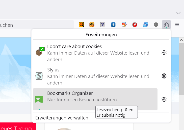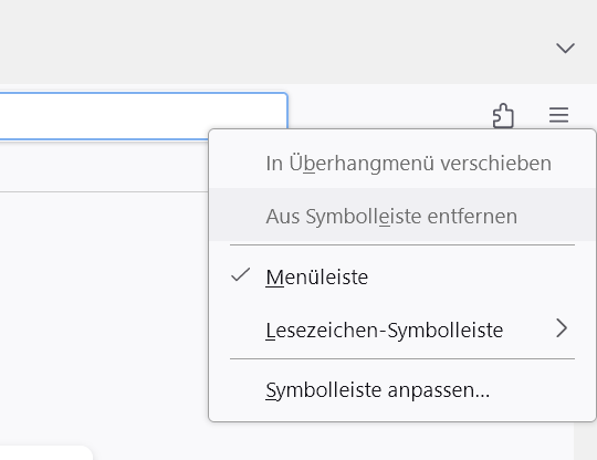Ich wäre sehr dankbar, wenn mir jemand helfen könnte die Firefox Erweiterungen aus der Symbollseiste zu entfernen. Ich möchte es gerne entfernen, es ist aber dort wo steht "Aus Symbolleiste entfernen" gegraut und deshalb kann man da nicht draufklicken. Ich würde es einfach nur gerne aus der Symbolleiste entfernen, aber ich weiss nicht wie. Kann mir da jemand helfen? Ich habe irgendwo gelesen das sei so beabsichtigt. Aber wenn das so beabsichtigt ist, dann helft mir bitte wenigstens es aus der Symbolleiste zu entfernen, es müsste ja nicht ganz aus Firefox entfernt sein, wenn das nicht erlaubt "wäre". Ich gehe davon aus dass es erlaubt ist es aus der Symbolleiste zu entfernen. Es geht um das sogenannte "Puzzle"-Symbol. Habe schon alles probiert, ich hoffe, es kann mir da jemand helfen. Danke. Bis später.