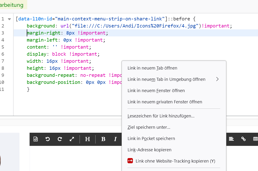 • Ich habe hier nun diesen CSS implementiert, bekomme den Eintrag mit dem Icon aber nicht korrekt eingepasst