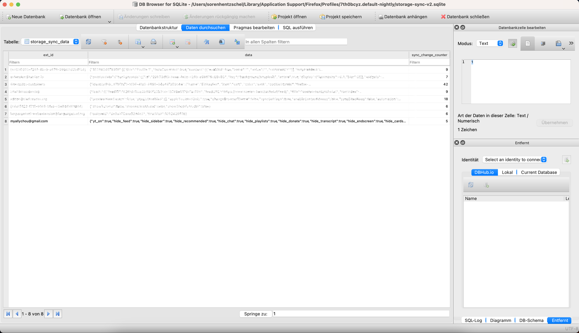 Einzig in der Datenbank "storage-sync-v2.sqlite-wal" finde ich diese Daten. Jedoch ist das nur eine temporäre Datei.