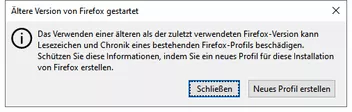 Das bedeutet, dass du ein Profil, das du ursprünglich mit einer älteren Firefox-Version genutzt hast, dann mit einer neueren Version verwendet hast und nun mit einer älteren Version wieder nutzen willst. Das wird seit Firefox 67 unterbunden. Das trifft vor allem auch zu, wenn du das gleiche Profil für unterschiedliche Veröffentlichungskanäle nutzen willst, z. B. für final und Nightly oder final und Beta.