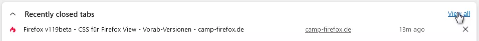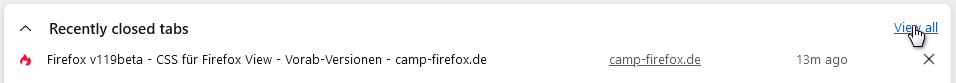 Alles anzeigen@-moz-document url(about:firefoxview-next) { .main-container { margin-top: 10px !important; } card-container:nth-child(2), card-container:nth-child(3) { display: none !important; } #pages { min-width: 1300px !important; } /* Background */ body { background-color: #eeeeee !important; } [data-l10n-id="firefoxview-collapse-button-hide"]:hover { background-color: #FDB0A4 !important; } body > fxview-category-navigation:nth-child(1) { display: none !important; } .sticky-container.bottom-fade { display: none !important; } .fxview-tab-row-title { min-width: 620px !important; max-width: 620px !important; } .fxview-tab-row-url, .fxview-tab-row-time { min-width: 200px !important; max-width: 200px !important; } }Es gibt noch einen Schritt für die "Release"-Version - so dass Sie beim Öffnen von Firefox View nicht mehr auf View All klicken müssen. Mit anderen Worten: FVN sollte sich öffnen, wenn die Schaltfläche "View All" bereits angeklickt ist.