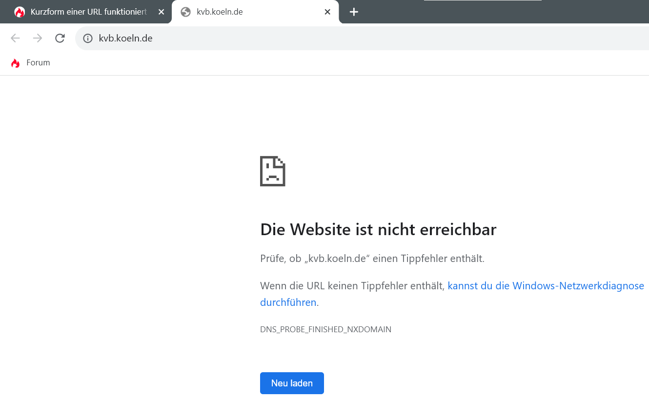 Seit etwa 2 Wochen bringt die Eingabe der Adresse "kvb.koeln.de" die Fehlermeldung "Netzwerk-Zeitüberschreitung", also Server nicht erreichbar. Gebe ich aber die vollständige URL ein "https://kvb.koeln", dann wird die Seite korrekt aufgerufen.