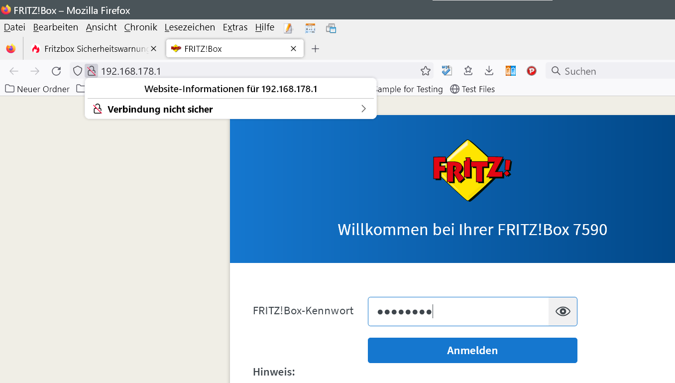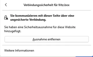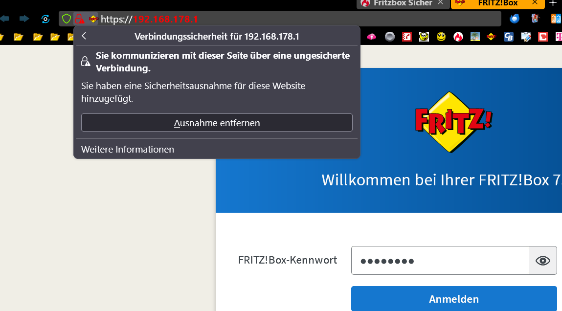 Ich rufe auf mit: https://192.168.178.1 . Dann akzeptiere ich das Risiko, die Seite wird geladen, alles ist gut. Dann geht das ungefähr 4 Wochen gut und dann kriege ich schon wieder diese Warnmeldung, wie gerade eben.