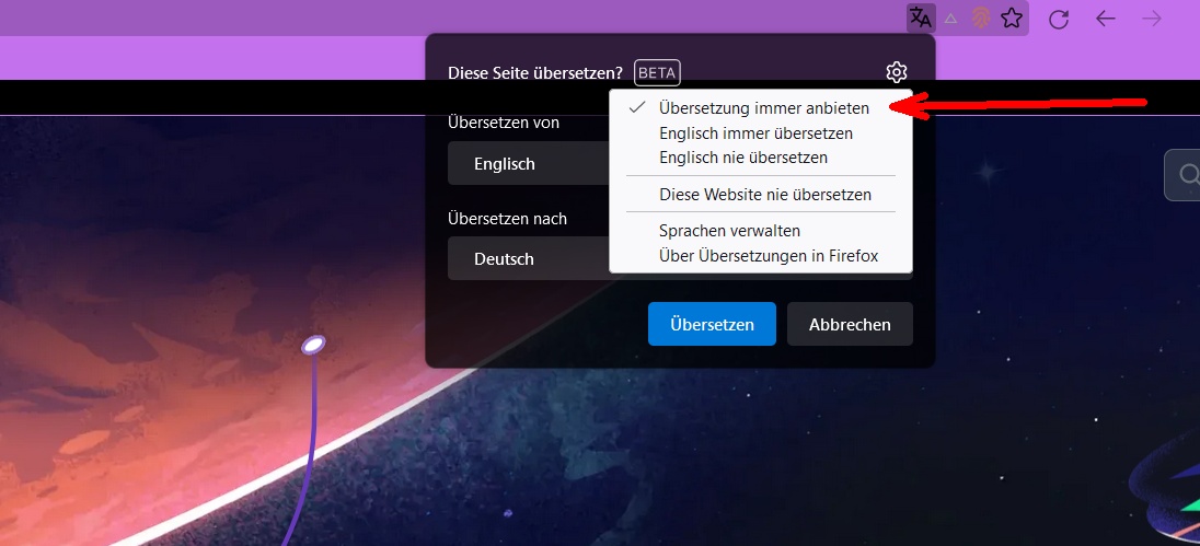 Um vielleicht noch etwas klarzustellen, was passiert, solange nicht tatsächlich eine Übersetzung angefragt wird: Firefox führt Code aus, um die Sprache einer Website zu erkennen. Das passiert auch, wenn die Option deaktiviert ist, dass immer eine Übersetzung angeboten wird, weil sich das nur auf das automatische Aufploppen des Übersetzungsdialogs bezieht und Firefox dann ja trotzdem das Symbol in der Adressleiste anzeigen möchte, wenn es angebracht ist. Das beeinflusst die Leistung von Firefox aber in keiner spürbaren Weise. -