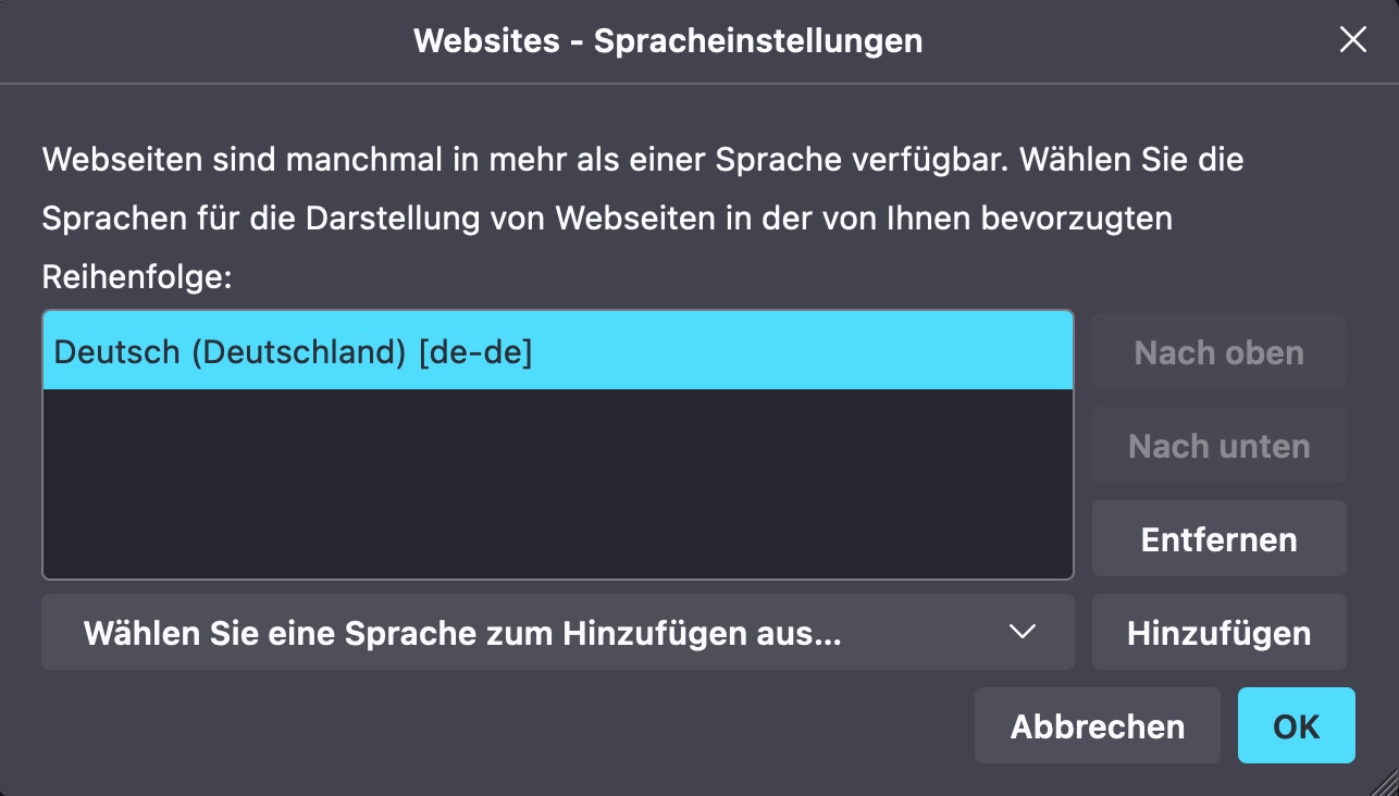 "Bevorzugte Sprachen für die Darstellug von Websites wählen" enthält: