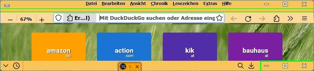 2-2.) Lesezeichenleiste und Titelleiste meinte ich nicht, sondern (wie hier im Screenshot) Menüleiste und NavBar. Aber da blockiert anscheinend die Icongröße (?) eine Verschmälerung ...