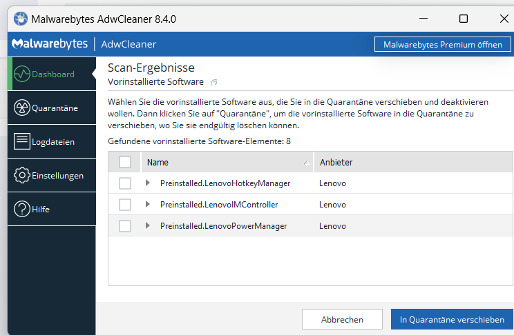 Die Lenovo-Apps würde ich so lassen - das kommt vom Hersteller des Rechners und könnte zu neuen Problemen führen, wenn du sie in Quarantäne schiebst...