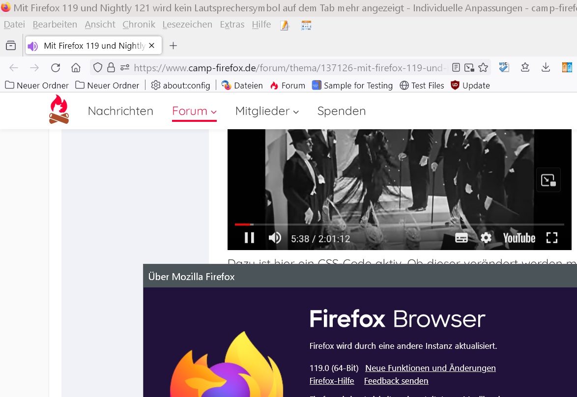 Hat den Titel des Themas von „Mit Nightly 121 wird kein Lautsprechersymbol auf dem Tab angezeigt“ zu „Mit Firefox 119 und Nightly 121 wird kein Lautsprechersymbol auf dem Tab mehr angezeigt“ geändert.