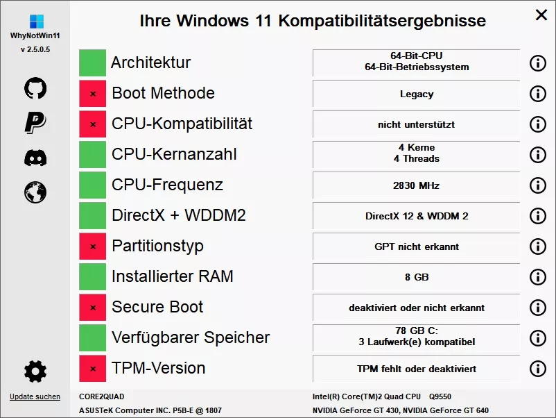Aber man sollte sich schon eingestehen, dass Hardware von 2006 zwar Windows 11 verkraften, aber mehr auch viel nicht. Um ein Beispiel zu nennen, Adobe hat die Hardwareanforderungen ziemlich hoch geschraubt und macht das an der CPU fest. SSE 4.2, und das wurde erst Ende 2008/Anfang 2009 implementiert (Intel Nehalem), bei AMD ab Ende 2011. TPM 2.0 seit 2013/2014. Im Prinzip ist jegliche Hardware, die ab 2014 gefertigt wurde, voll Windows 11 tauglich. (TPM 2.0 lässt sich ggf nachrüsten, oder fTPM aktivieren)