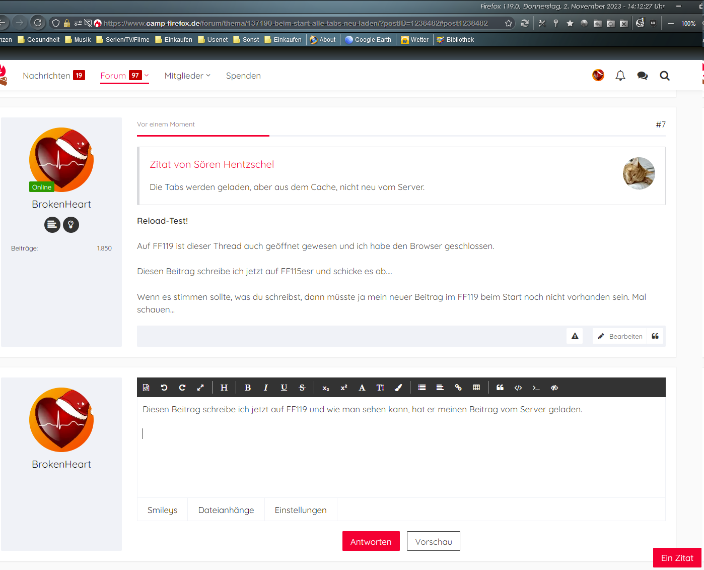 Diesen Beitrag schreibe ich jetzt auf FF119 und wie man sehen kann, hat er meinen Beitrag, von dem der Cache im FF119 noch nichts wissen konnte, vom Server geladen: