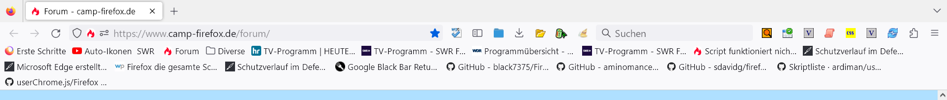 4. Wenn es euch so wie mir geht, dass man mittlerweile viel zu viele Ordner unter Favoriten abgelegt hat, dann wünscht man sich, dass man mehrere Leisten zur Verfügung hat. Auch dies ist möglich - entweder in einem Scroll-Menü oder wie bei Andreas im Themenbereich Lesezeichen Symbolleiste vergrößern möglich? unter Post #6. Irgendwie hat es aber bei mir nicht zur Lösung geführt und ich habe weiter gesucht. Gefunden habe ich dann folgenden Link https://www.windowspower.de/firefox-73- mehrzeilige-lesezeichen-symbolleiste/ und der ist von wem? Natürlich von Andreas, und diesen Code habe ich dann unter dem anderen eingefügt und es funktioniert.