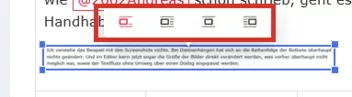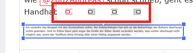 … welche wie beschrieben jetzt spürbar einfacher ist. Die Textfluss-Option ist nicht länger in einem Dialog versteckt, sondern direkt verfügbar und ist durch die graphischen Buttons intuitiver bedienbar als zuvor. Die Option zum Zentrieren ist neu, die gab es vorher nicht. Das Ändern der Bildgröße war vorher auch nicht im Editor möglich, jetzt schon.