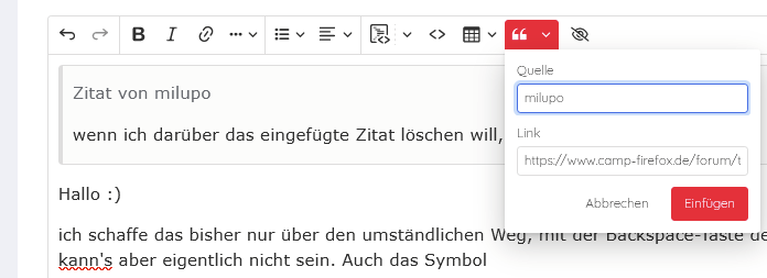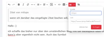 • ich habe bisher noch nicht entdeckt, wie ich ein eingefügtes Zitat komplett wieder löschen kann. Bisher habe ich dazu auf den Zitatkopf und dann auf Löschen geklickt. Ich finde es auch deutlich umständlicher, ein Fremdzitat mit Quelle und Link einzufügen.