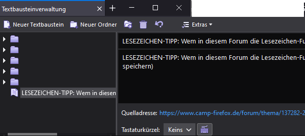 • LESEZEICHEN-TIPP: Wem in diesem Forum die Lesezeichen-Funktion für einzelne Beiträge fehlt (so wie mir), der kann sich mit folgendem Add-On vielleicht ''etwas behelfen'' (kann auch Smilies speichern)🦔🙇😄🍀♥️ 8)