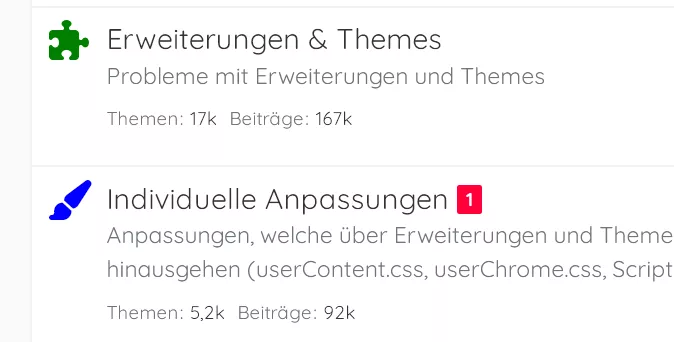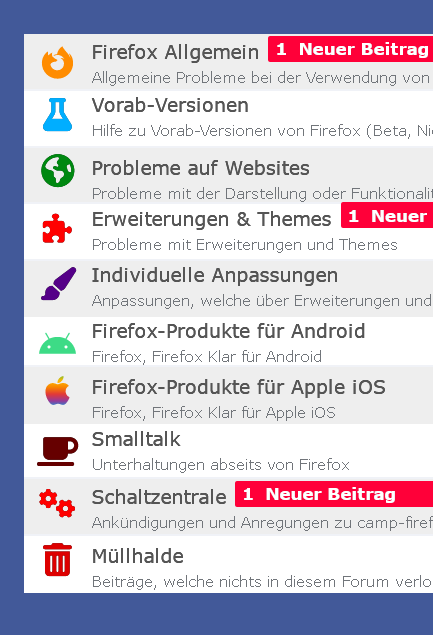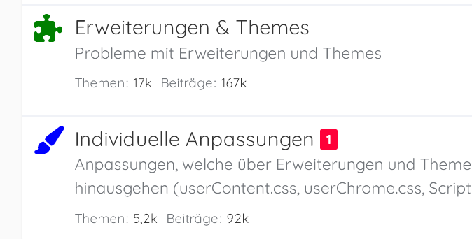 in der vorangegangenen Forumsversion hatte ich die Symbole der Unterforen auf der Startseite des Forums farblich angepasst. Grundlage für die Anpassungen waren .fa-Klassen. Statt ihrer wird jetzt das Element fa-icon verwendet, denen das Attribut name zugewiesen ist. Das klappt zum großen Teil, wenn man fa-icon[name] verwendet, z. B. fa-icon[name=gears] für die Schaltzentrale. Bei drei Symbolen klappt die Anpassung nicht, und zwar für Fiefox Allgemein, Firefox-Produkte für Android und Firefox-Produkte für iOS. Ich habe herausgefunden, dass alle drei mit fa-icon[name=folder-open] definiert sind. Dadurch kommen sie sich offenbar ins Gehege. Auch mit der Selektorketten-Variante funktioniert es nicht, obwohl die sich unterscheiden: