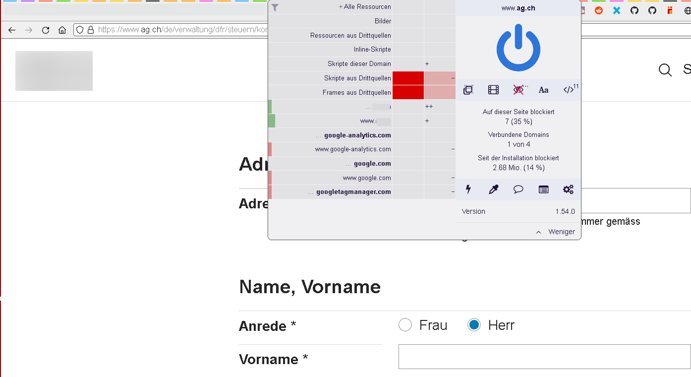 Frage: Auf dem Printscreen von uBlockOrigin sieht man, dass Elemente von Google auf der Seite eingebaut sind.