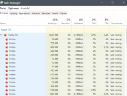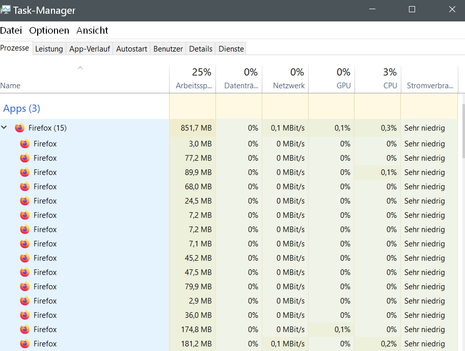 durch Zufall (Ursachenforschung langsames Verhalten von FF) habe ich im Taskmanager (Prozesse) mal den Resourcenverbrauch von FF gesehen und war etwas überrascht. ca. 500-600MB für ein "leeres" FF-Fenster. Und hinter Firefox steht im Taskmanager eine Zahl in Klammern, (z. B. anfangs "Firefox (10)", obwohl nur ein Fenster offen ist.)