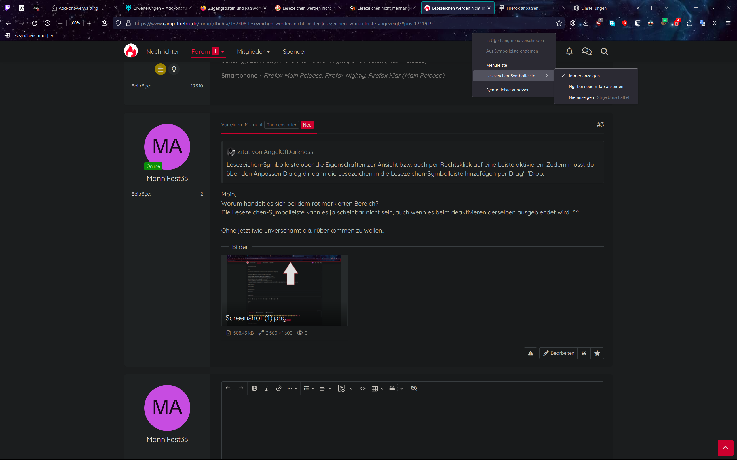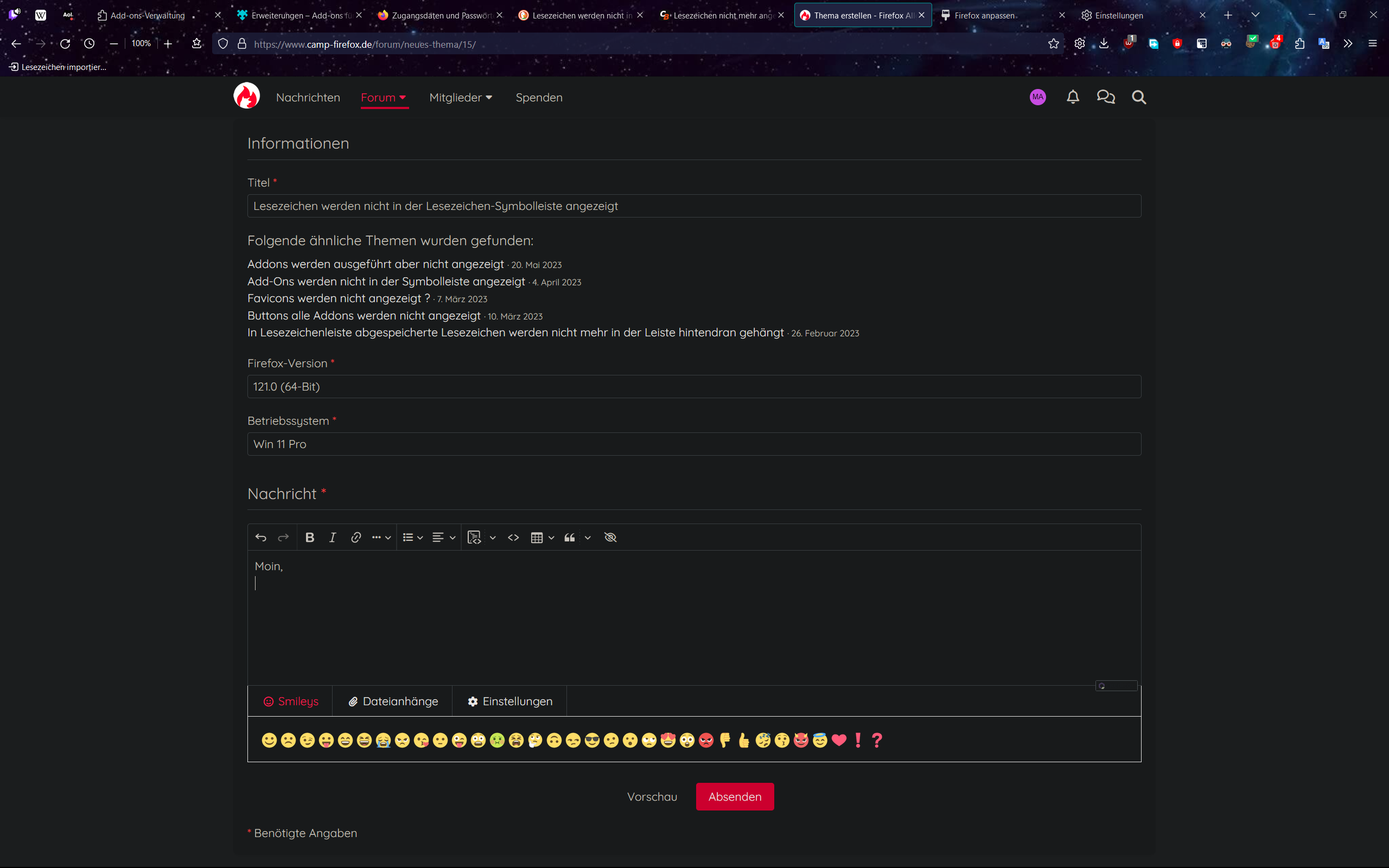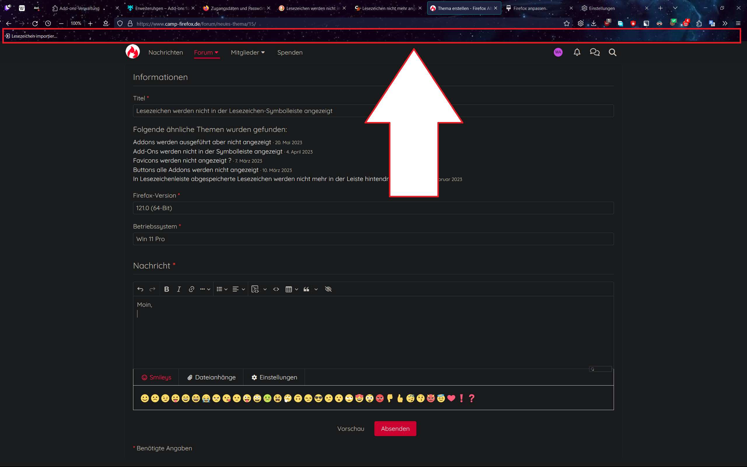 dass meine Lesezeichen-Symbolleiste nicht ordnungsgemäß funktioniert und ich nicht nur für deren Bedienung, sondern auch zum Finden eines schon aufgezeigten Lösungsweges zu doof bin..^^