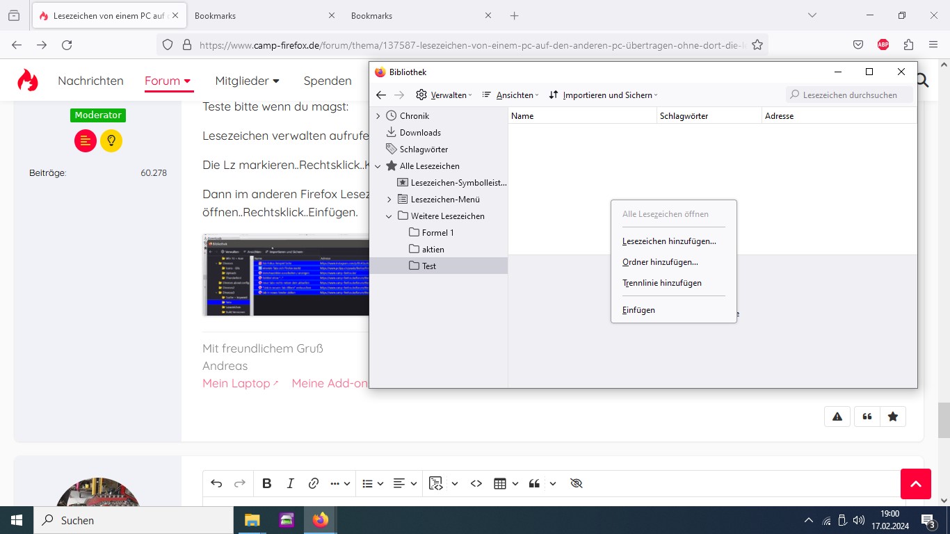 ich habe ein wenig hier gesucht wie man Lesezeichen z.B. von einem PC ( ebenfalls Firefox ) auf einen anderen PC in das Firefox einbringt, ohne daß die alte Lesezeichenliste überschrieben wird. Denn dann sind die alten Lesezeichen weg. Habe leider nichts gefunden oder nicht richtig gesucht? Ich will halt beide Listen zusammenfügen. Denn wenn ich importiere wird überschrieben. Oder kann man da irgendwo etwas einstellen daß das nicht passiert?