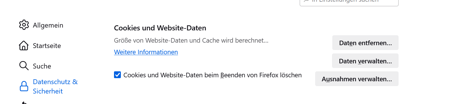In den Einstellungen unter Datenschutz + Sicherheit --> Cookies und Website Daten ist der Datenschutz auf "Standard" gesetzt. Ich habe ein Häkchen bei "Cookies und Website-Daten beim Beenden von Firefox löschen". Denn das möchte ich ja im privaten Modus so haben.