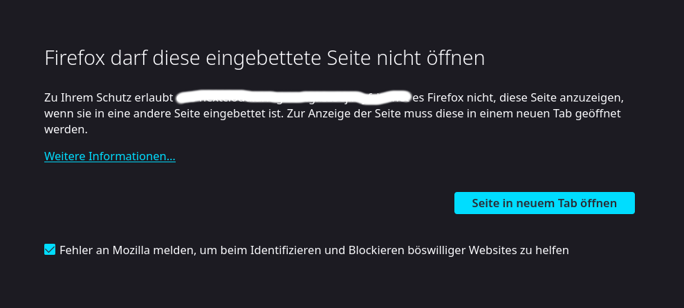 Das Problem ist nun folgendes, dass beim Aufruf der subdomain die Weiterleitung zwar stattfindet, Firefox aber die Weiterleitung verhindert mit der Meldung: Firefox darf diese eingebettete Seite nicht öffnen (siehe Screenshot/Anhang)