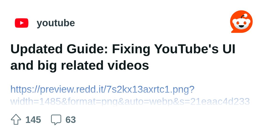 Aus der Community youtube auf Reddit: Updated Guide: Fixing YouTube's UI and big related videosEntdecke diesen Beitrag und mehr aus der Community youtubewww.reddit.comGruß, Nobby