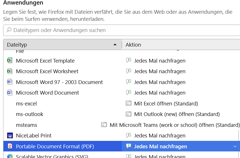 ich habe schon seit Ewigkeiten das gleiche Problem mit der Einstellung in Firefox was mit einer Datei/Anwendung beim Öffnen passieren soll.