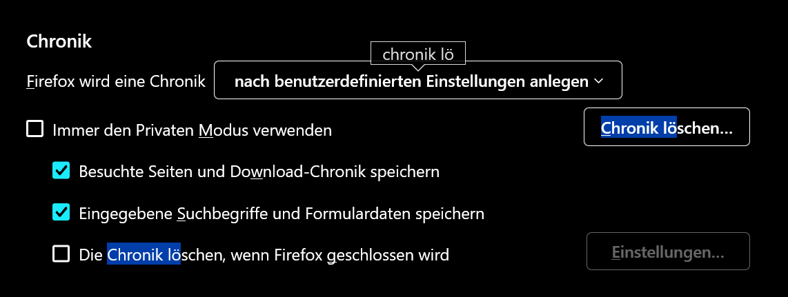 • ob du die Einstellung "Die Chronik löschen, wenn Firefox geschlossen wird" aktiviert oder verändert hast.