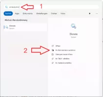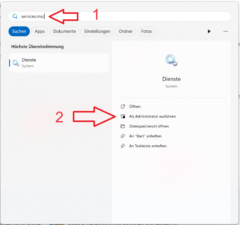Öffne die Verwaltungskonsole für Dienste, indem du services.msc in das Suchfeld eingibst und auf Dienste klickst.