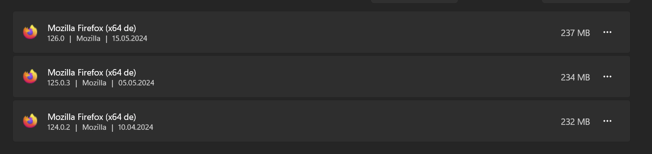 Scheinbar habe ich z. B. aktuell drei Firefox-Versionen auf dem Rechner. Die aktuelle 126.0 und die zwei in dem Screenshot gezeigten. Würde ich erneut den Winget-Befehl anwenden, wären es danach wohl noch mehr. Kann man mittels Winget einzelne Instanzen wieder löschen?