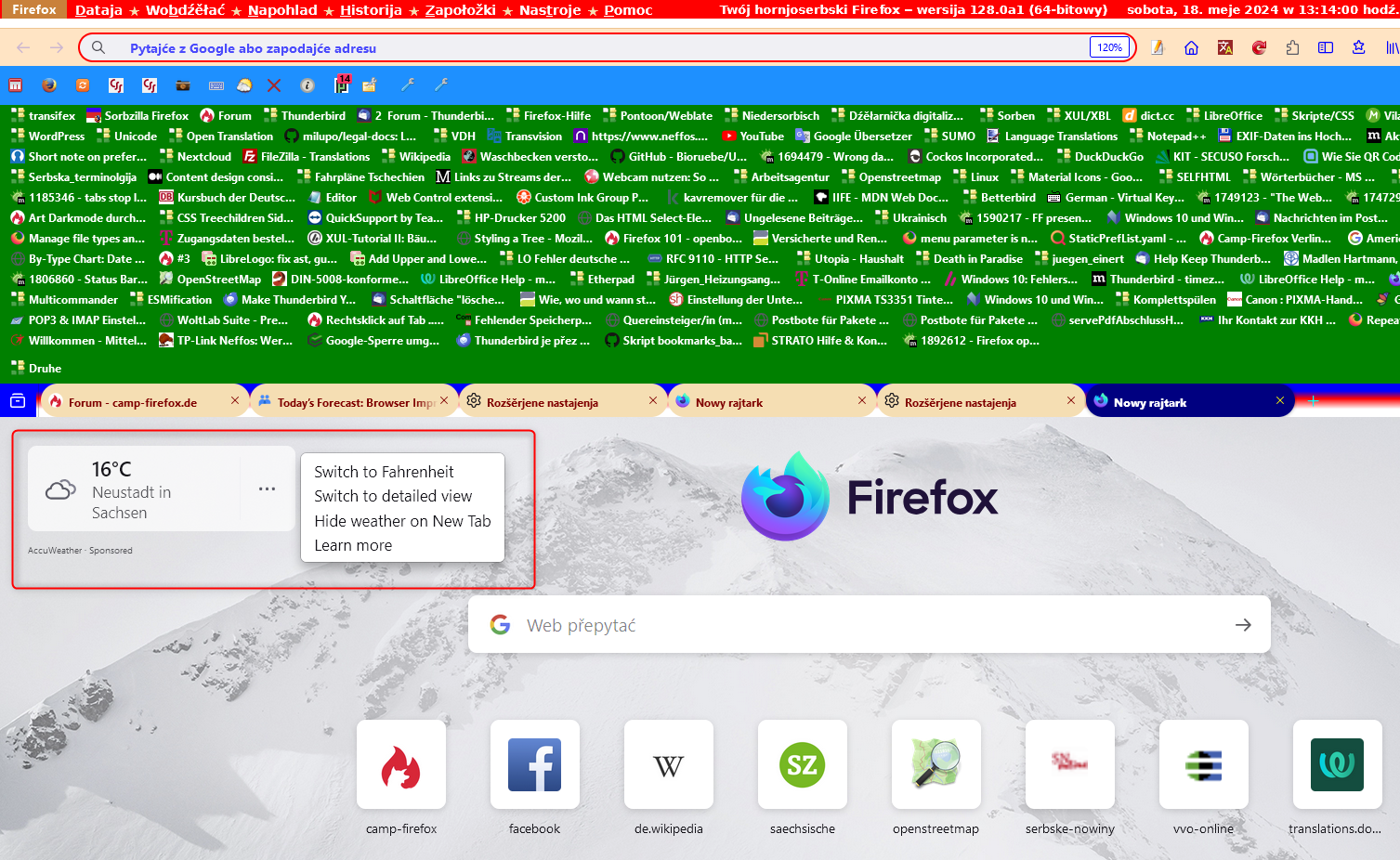 Die Temperaturangabe ist standardmäßig in Fahrenheit, aber ihr könnt in about:config die Einstellung browser.newtabpage.activity-stream.weather.temperatureUnits auf c für Celsius setzen. Außerdem könnt ihr browser.newtabpage.activity-stream.weather.display auf detailed setzen. Dann seht ihr etwas mehr Angaben. Ich nehme mal an, dass es in Zukunft mehr Angaben geben wird. Diese beiden Einstellungen braucht ihr aber nicht in about:config verändern, das könnt ihr auch auf der Firefox-Startseite mit dem Einstellungsmenü der Wetterfunktion machen.