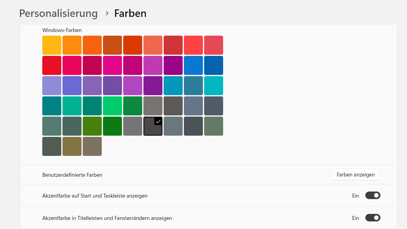 Eben gerade nach erneuter Überprüfung der W11-Einstellung sehe ich in der Tat zum ersten Mal, dass Windows diese und auch andere Farben freigeschaltet hat. Die Bilder dazu sende ich dir im Anhang.