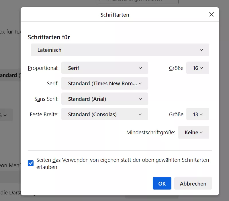 "Seiten das Verwenden von eigenen statt der oben gewählten Schriftarten erlauben"