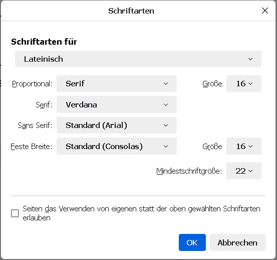 "Seiten das Verwenden von eigenen statt der oben gewählten Schriftarten erlauben"