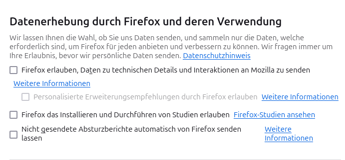 Die kann doch nicht so gewollt sein, zumal ich die Einstellungen von Firefox unmittelbar nach der Installation von Ubuntu vorgenommen habe und dennoch angeblich bereits an diversen Studien teilgenommen hätte.