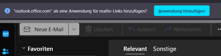 Ich bin via Fux immer mal bei Outlook (https://outlook.office.com/mail/) und jedesmal wird eine Leiste eingeblendet, ob man mailto.office.com nicht als Anwendung für mails einrichten wolle (nein, will ich nicht!). Die Antwort merkt sich der Schrott leider nicht, daher die Frage: kann man das nervige Zeux nicht irgendwo abschalten?