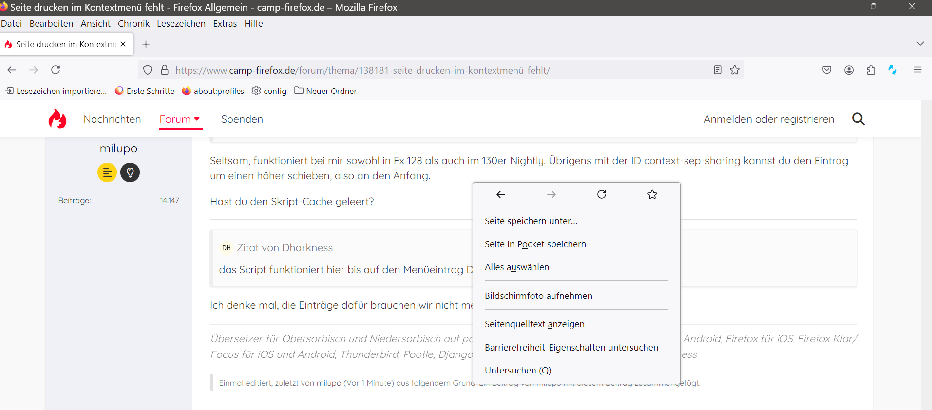 mir ist aufgefallen, dass im Kontextmenü die Option "Seite drucken" nicht mehr verfügbar ist. Wurde diese entfernt, oder habe ich da was verstellt? Wenn die Option entfernt wurde - gibt es ein Script, um diese manuell wieder hinzuzufügen?