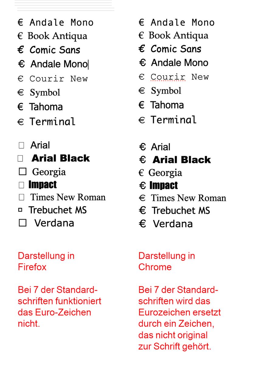 Seit kurzem wird bei einigen Standardschriften wie Arial und Verdana das Eurozeichen und andere Sonderzeichen nicht mehr angezeigt. Dieselben Websites in Chrome oder auf dem Handy funktionieren.