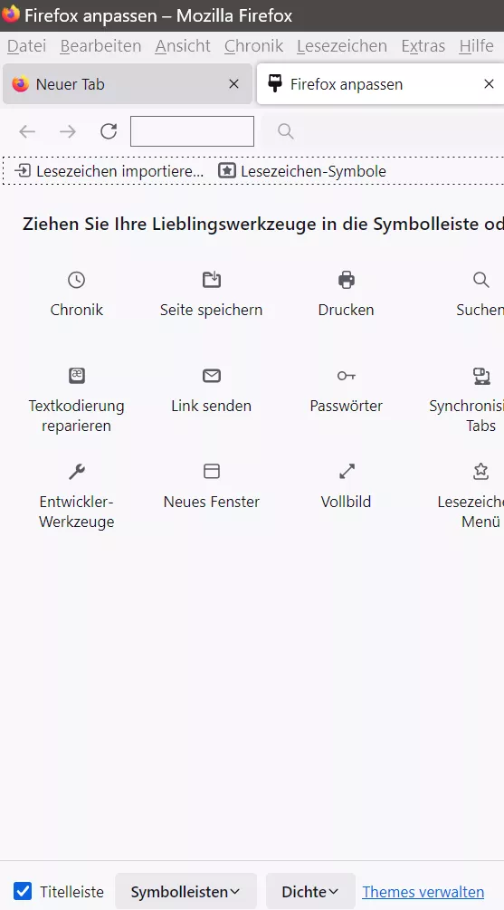 • Menü → Weitere Werkzeuge → Symbolleiste anpassen…