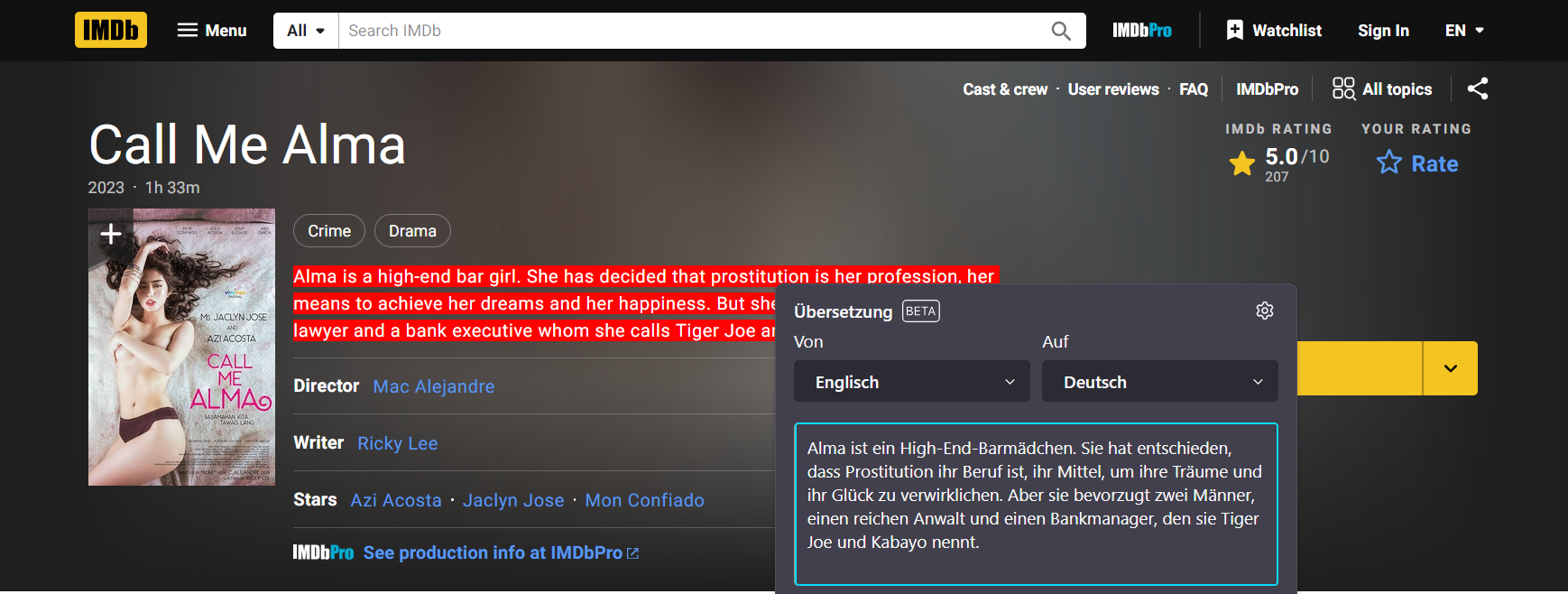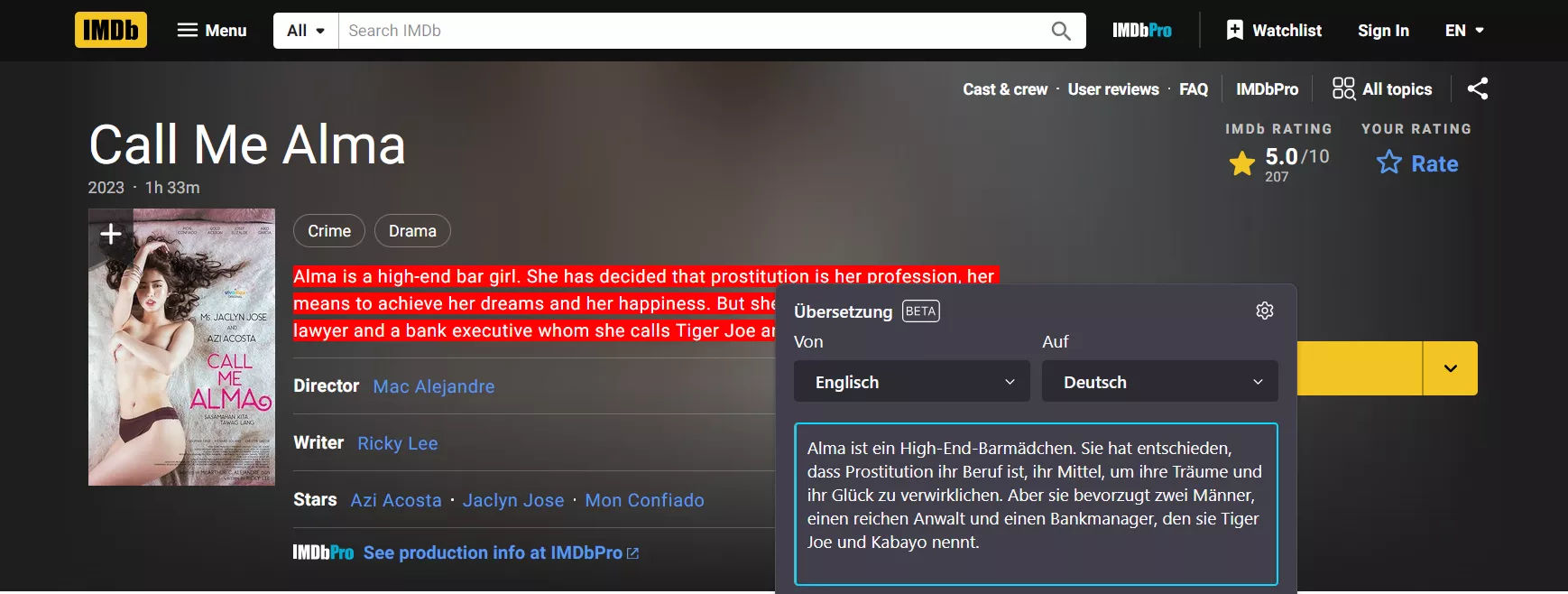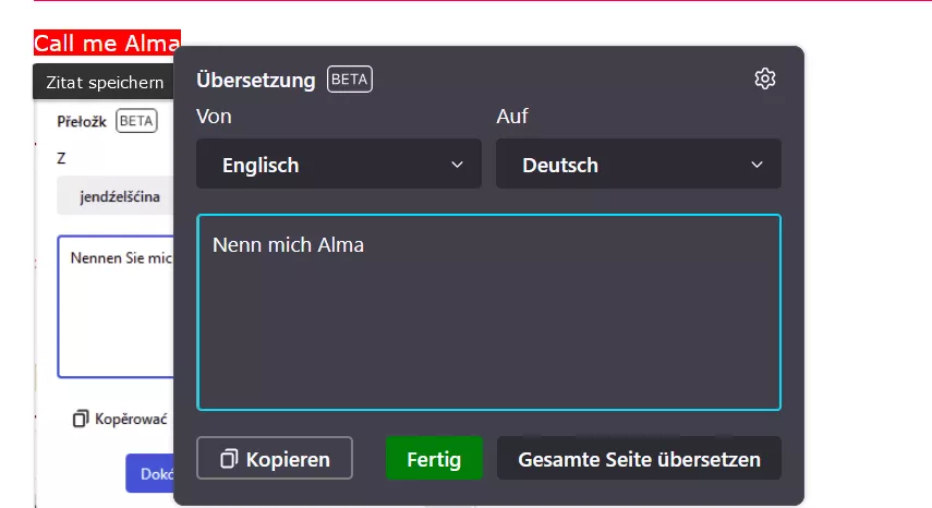 Ich bin noch auf meinem alten Rechner, kann also nicht übersetzen. Ich würde aber erwarten, dass dann Alma stehen bleibt. Aber zumindest Call und me sollten dann übersetzt werden.